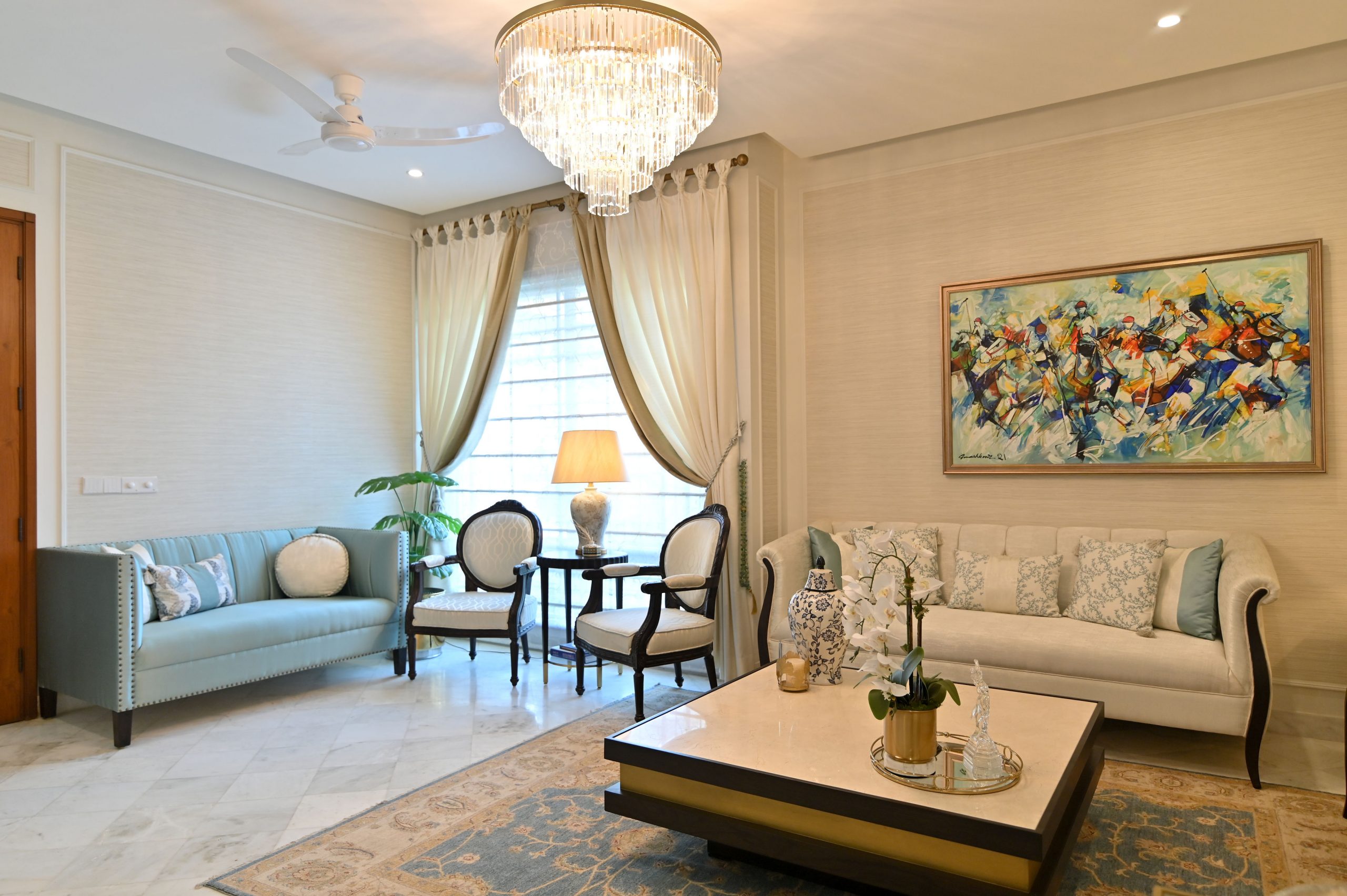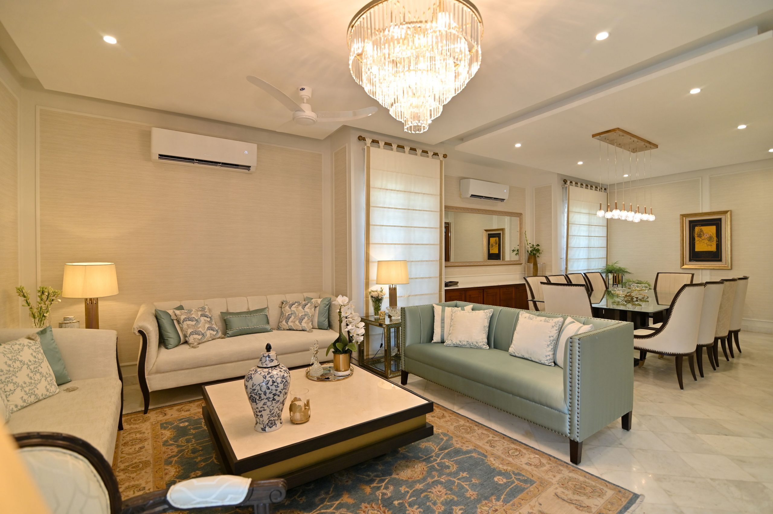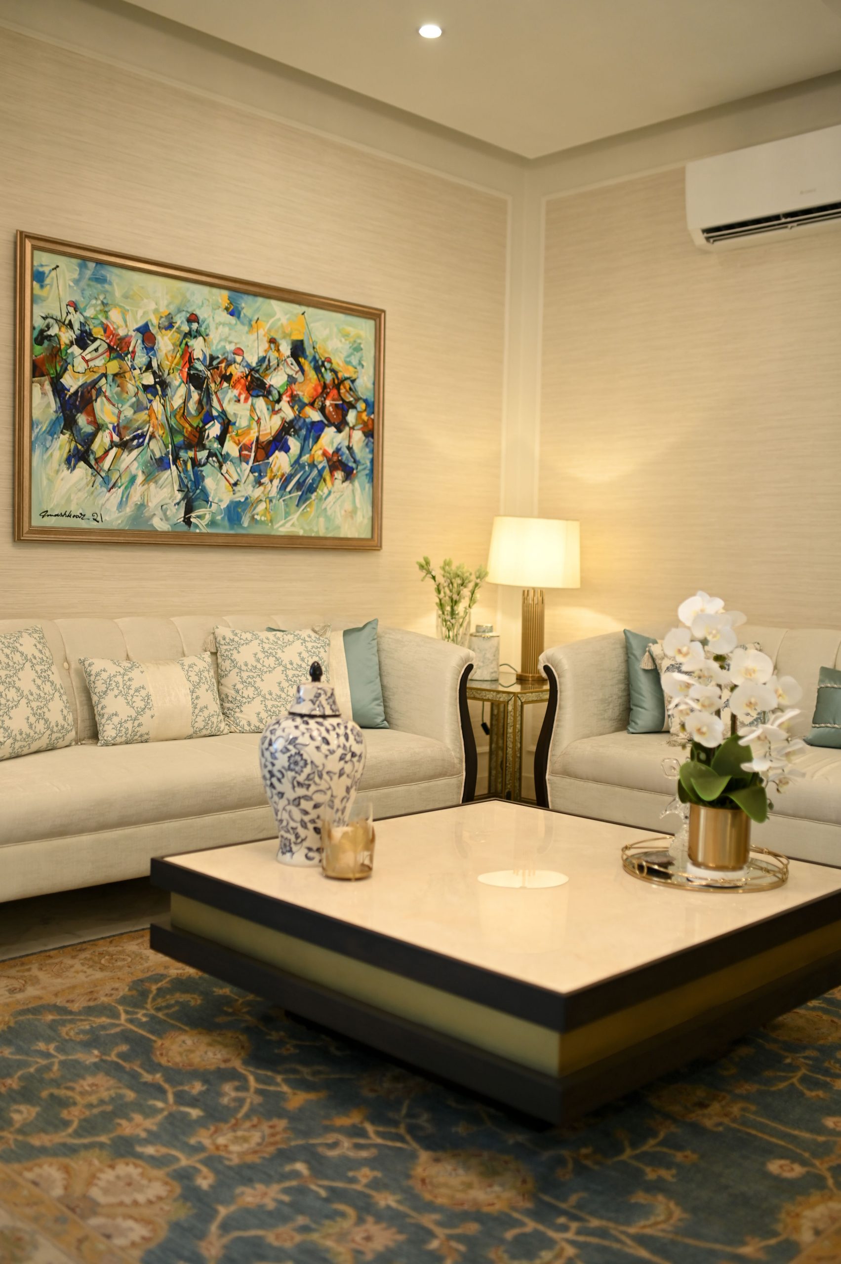 In this captivating space, teal green sofas and pristine white counterparts come together in a symphony of harmony. Patterned cushions, adorned with hints of teal green, add character and charm to the room.