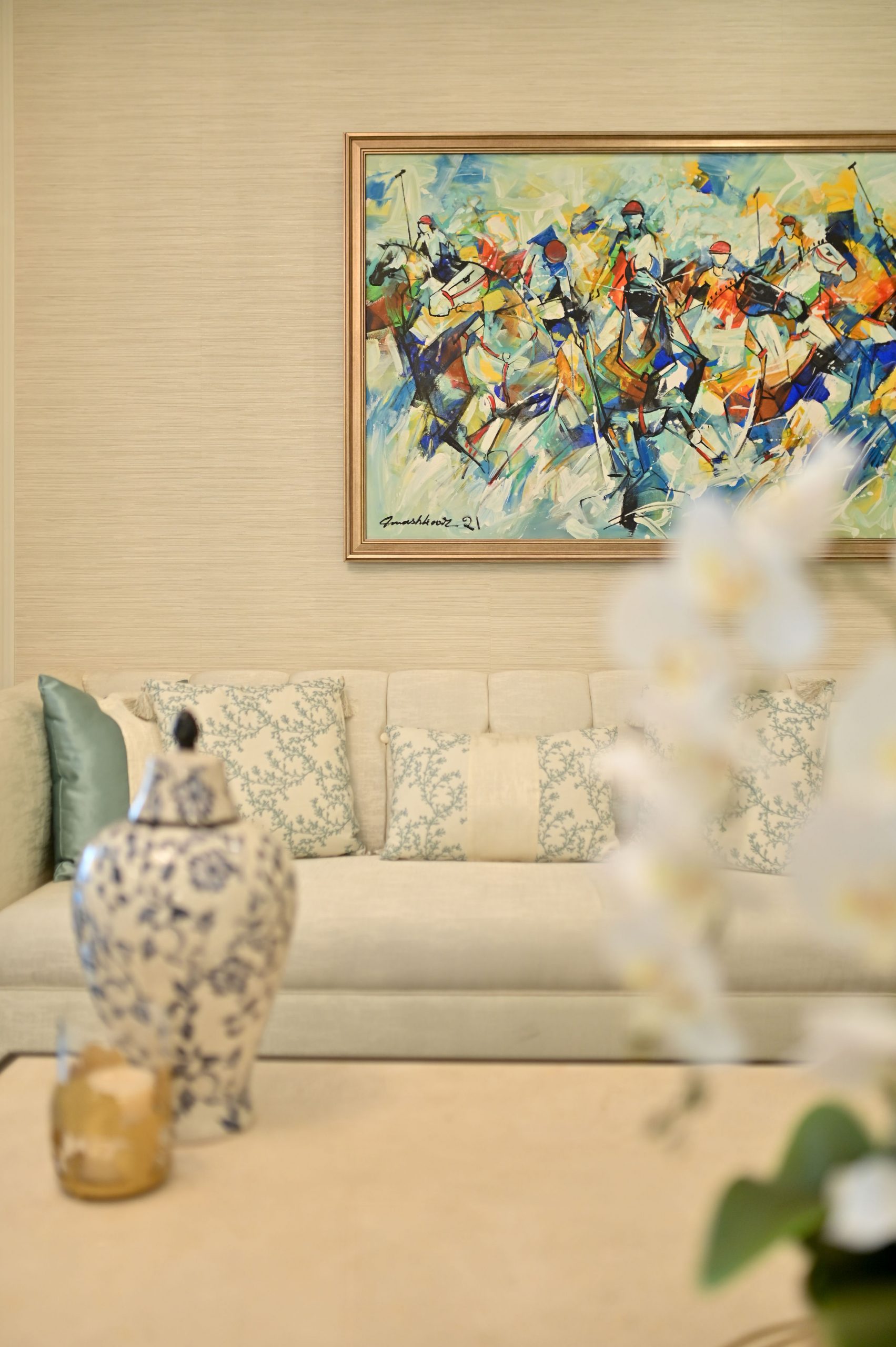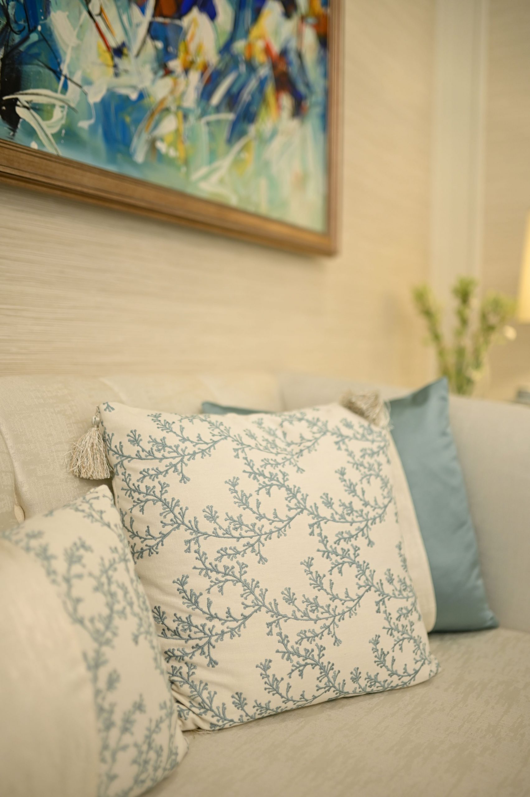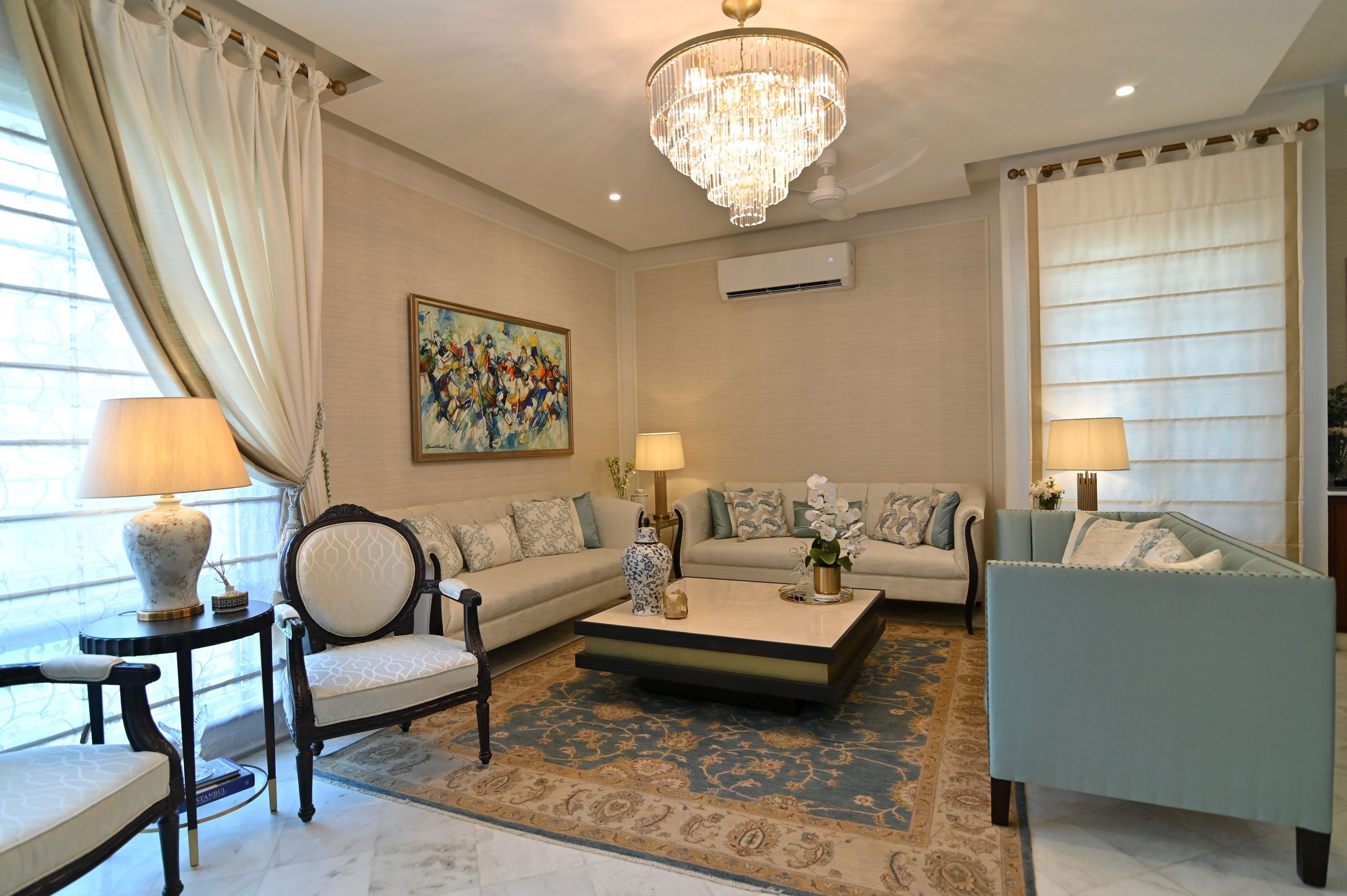 In this captivating space, teal green sofas and pristine white counterparts come together in a symphony of harmony. Patterned cushions, adorned with hints of teal green, add character and charm to the room.