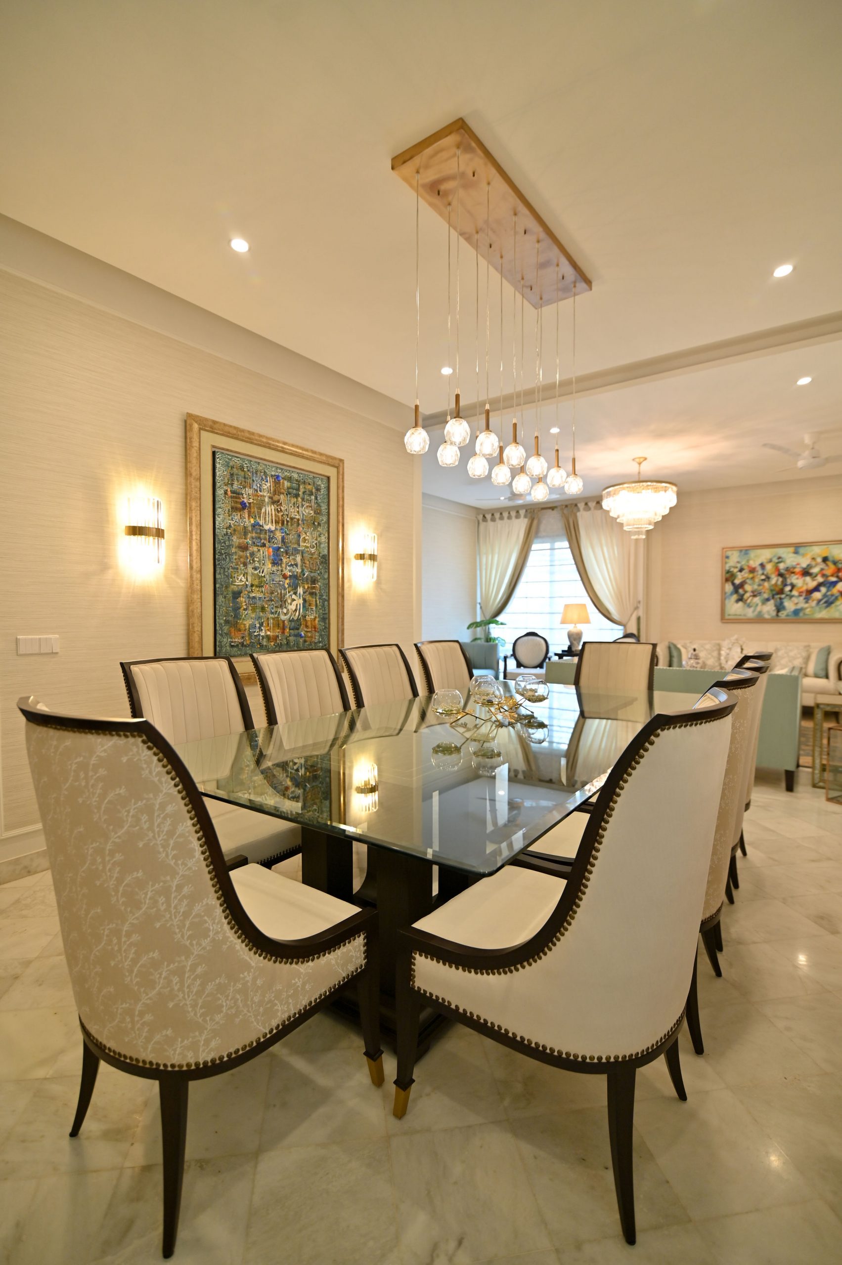 A glass and wood dining table takes center stage, surrounded by white chairs graced with dark brown wood accents. It’s a setting that marries elegance with practicality, inviting you to savor culinary delights.