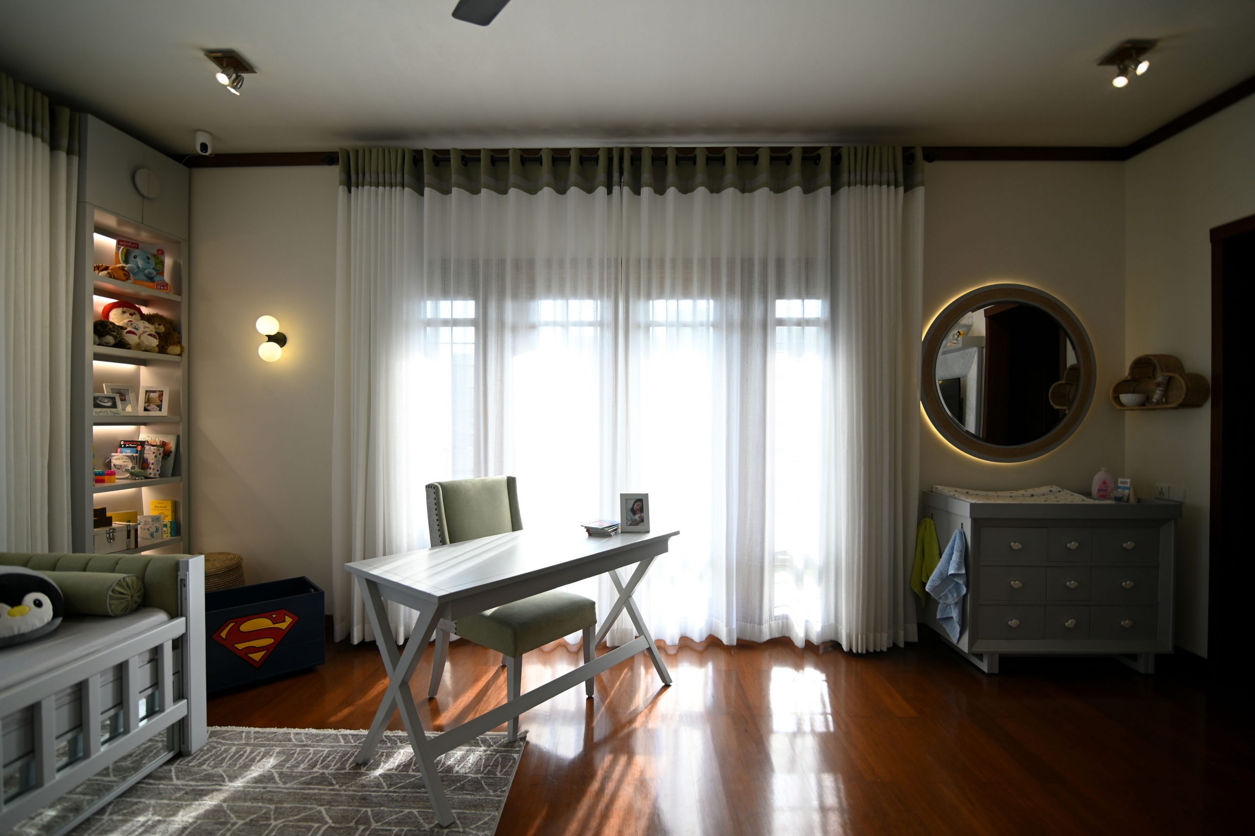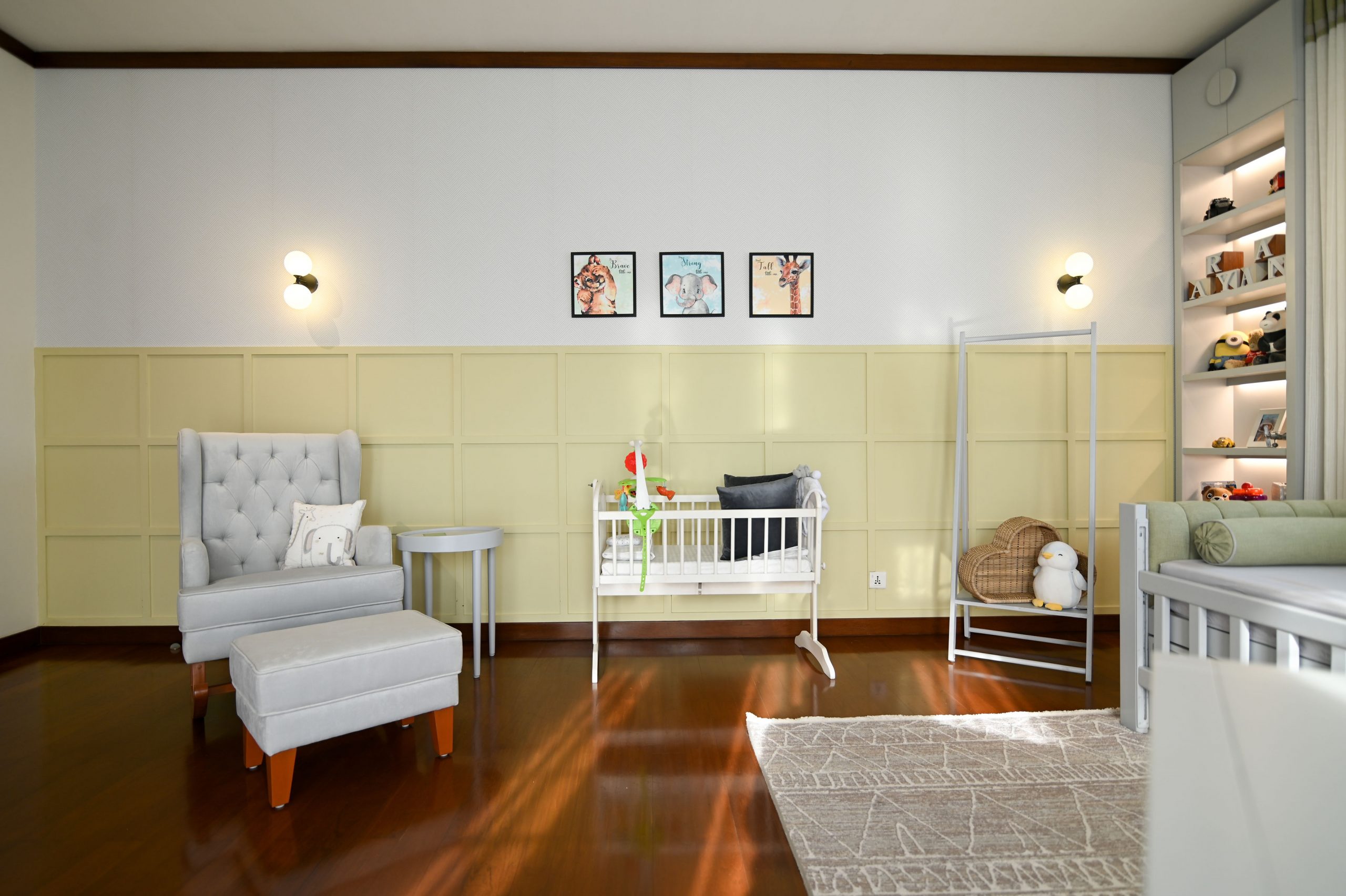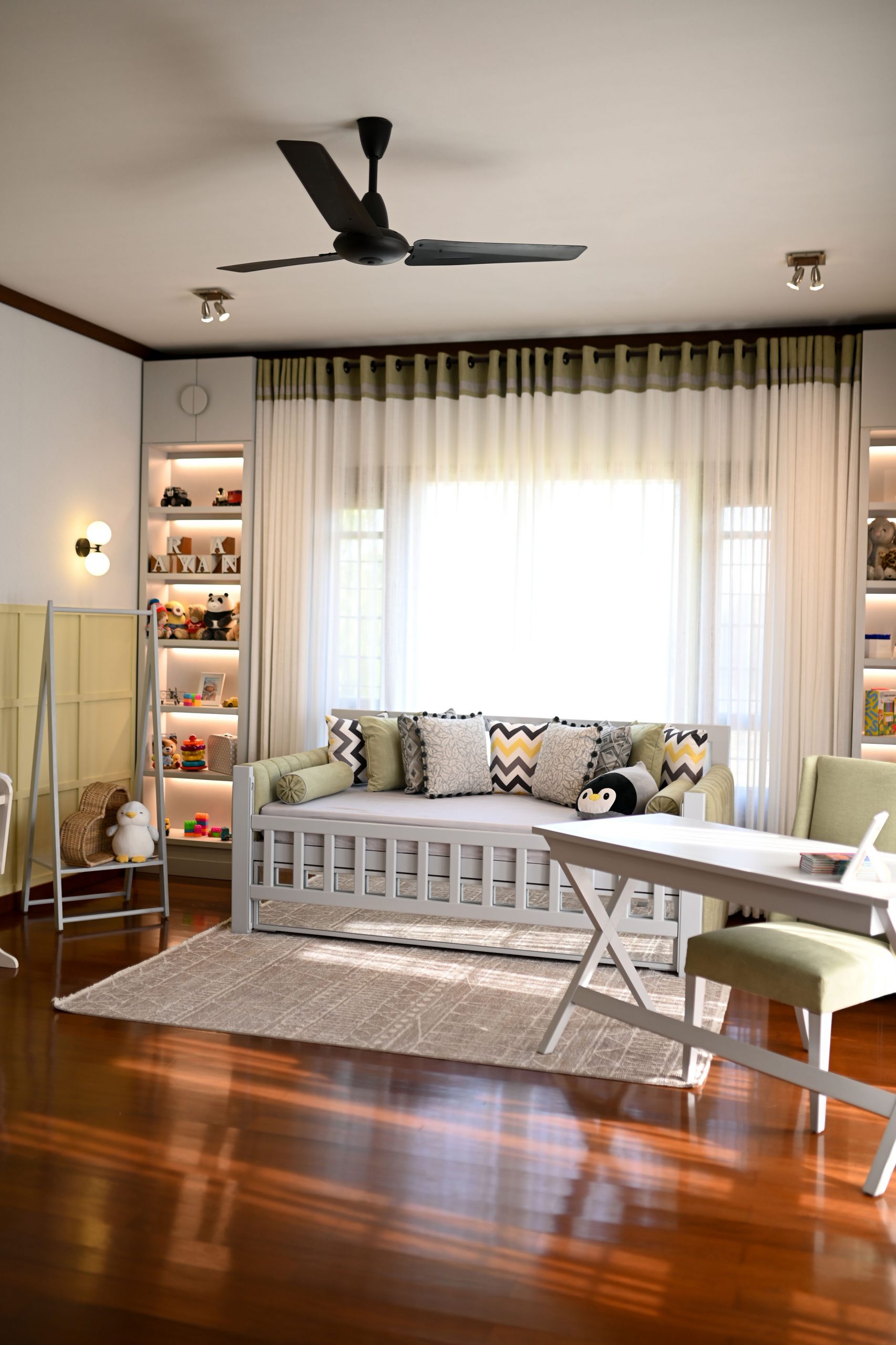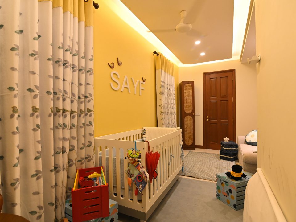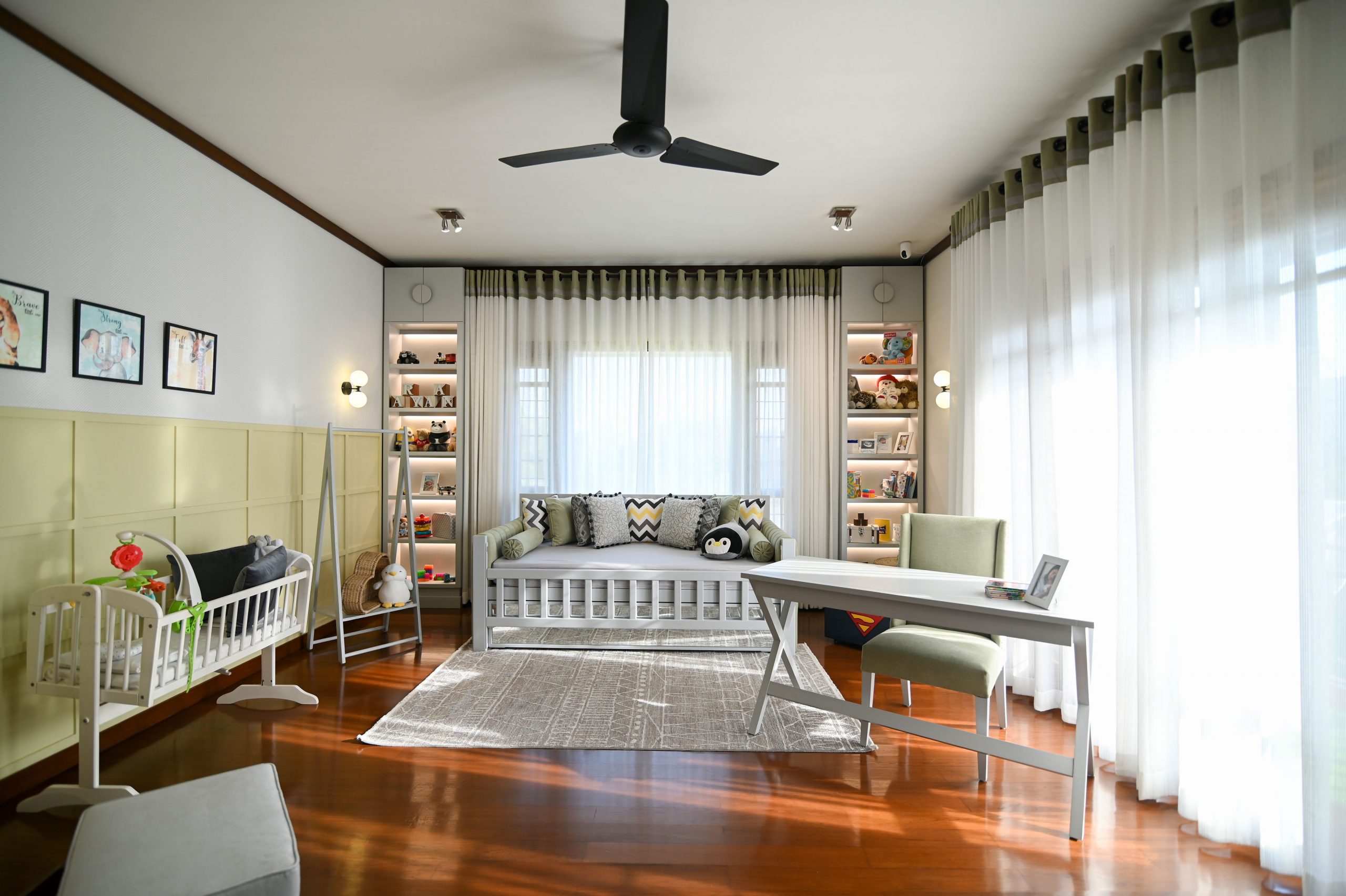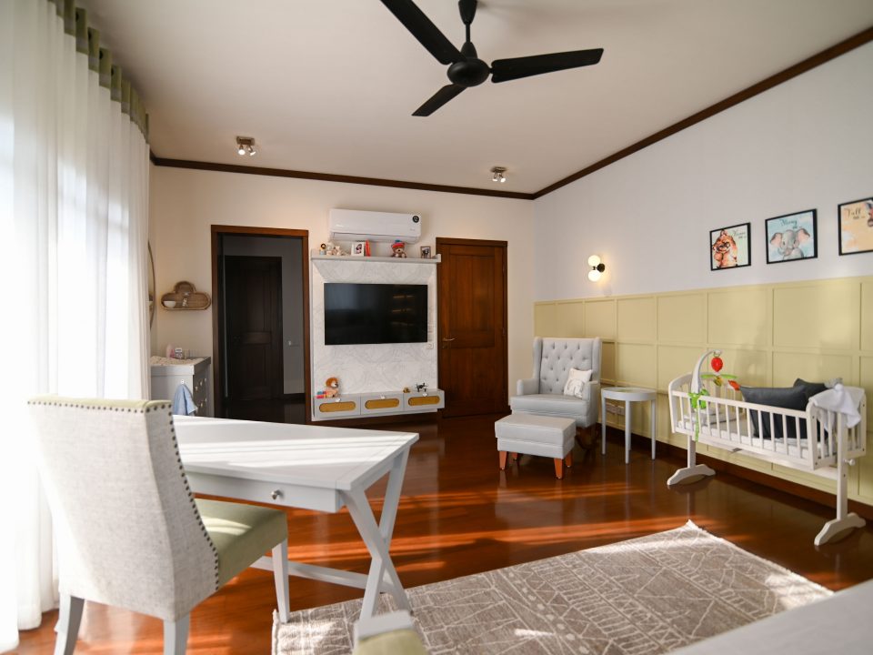 In the realm of design, where life meets functionality, we embarked on a project that beautifully blends the worlds of motherhood and productivity. Our latest creation is a nursery-office, a space where both mom and child can find solace and inspiration. A generous window bathes the room in natural light, connecting the indoors with the outdoors. It’s a portal to endless possibilities and moments of reflection. Brown wooden flooring sets the stage for a cozy and practical foundation. It’s a choice that balances aesthetics with the demands of daily life. A grey day bed becomes the heart of the nursery, adorned with pops of yellow cushions for a touch of cheerfulness. It’s a space where both mom and child can relax and bond.