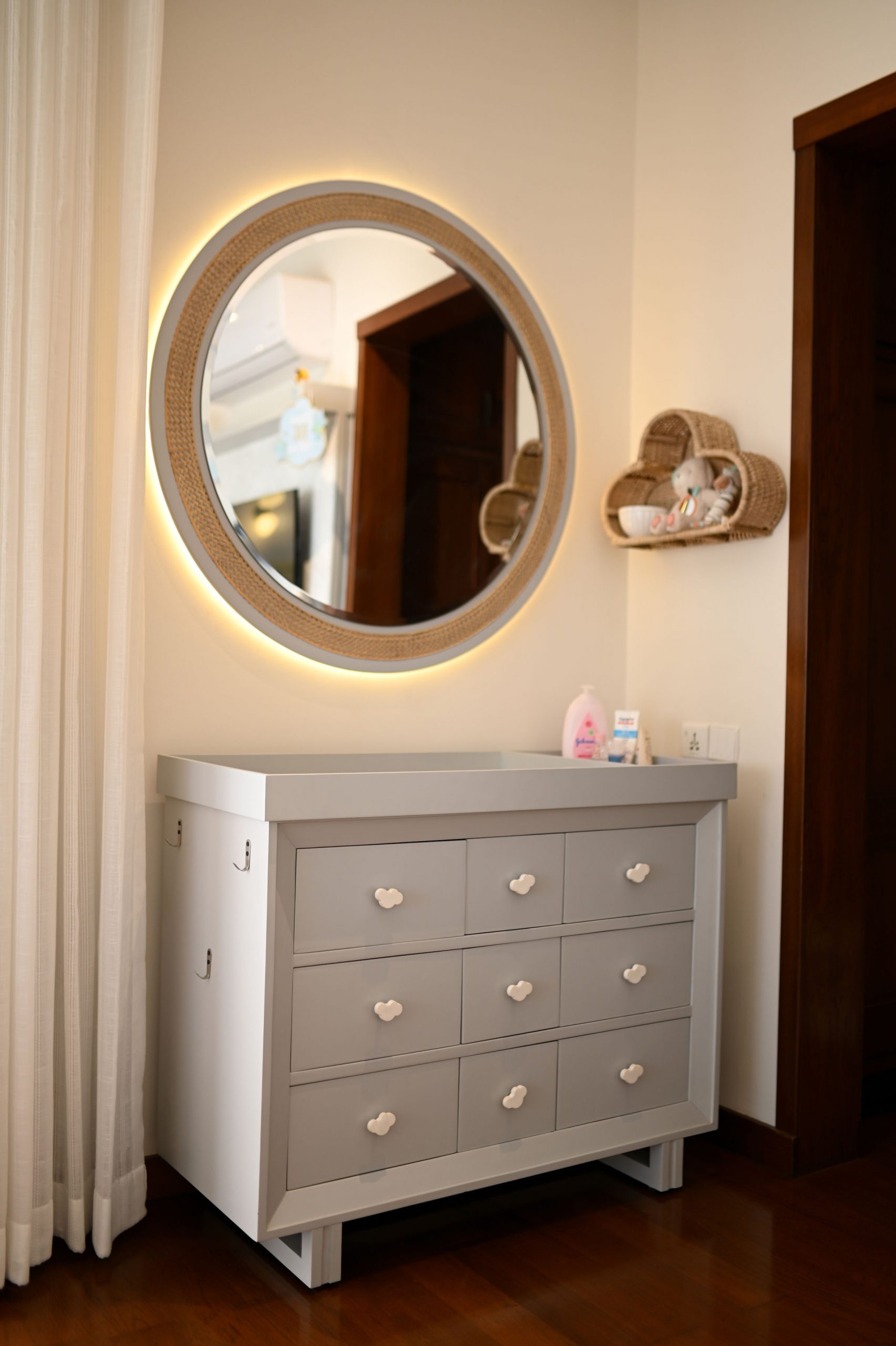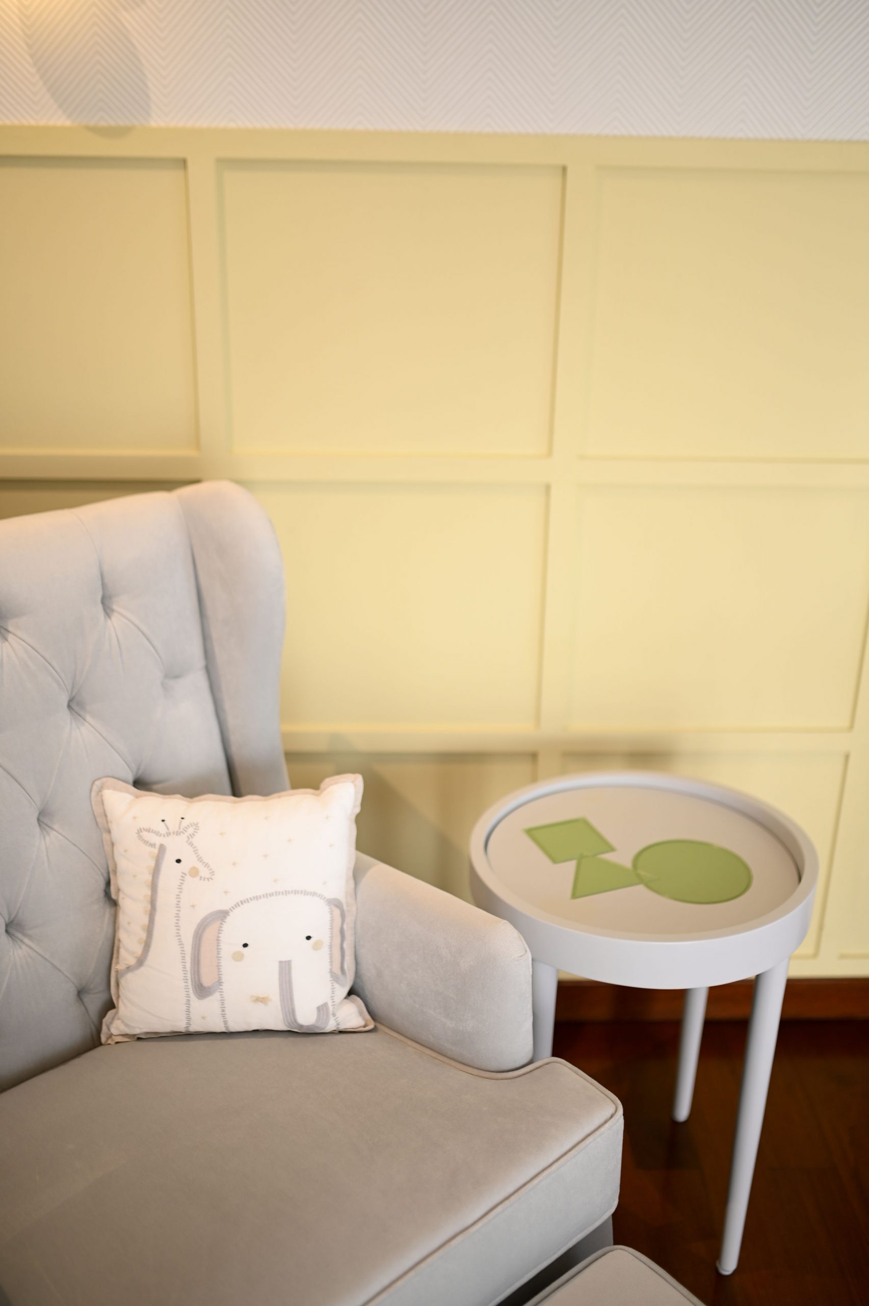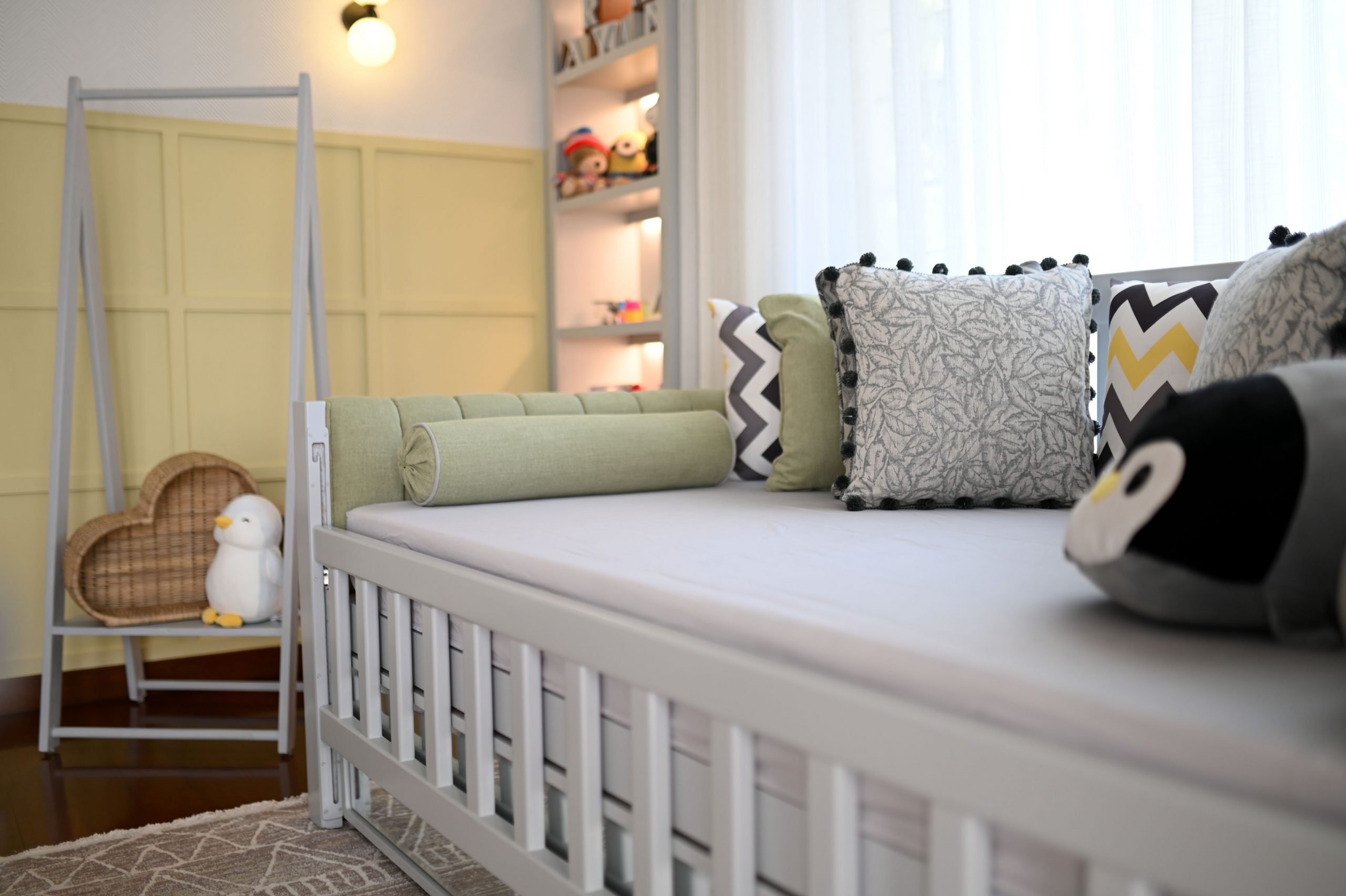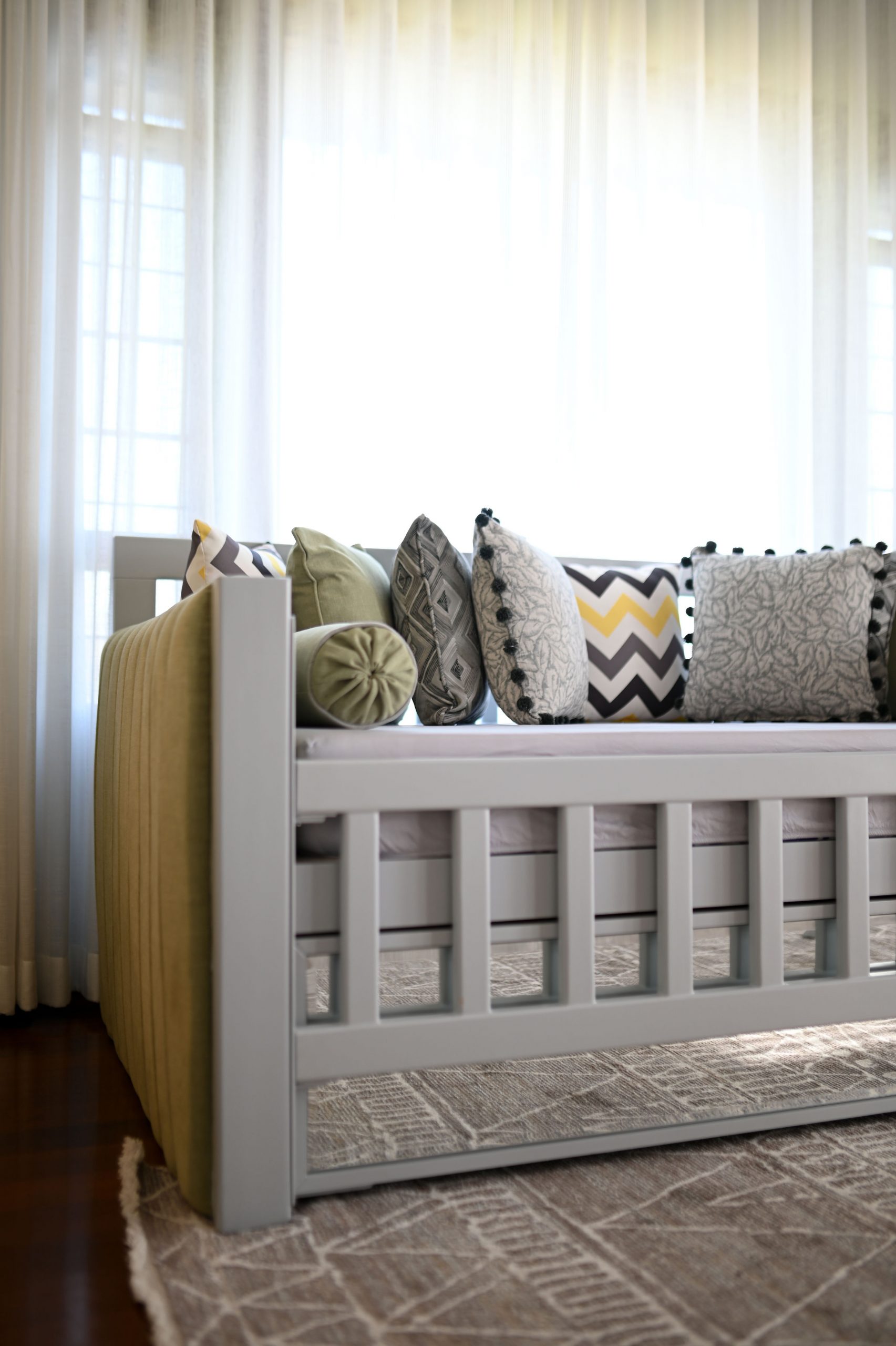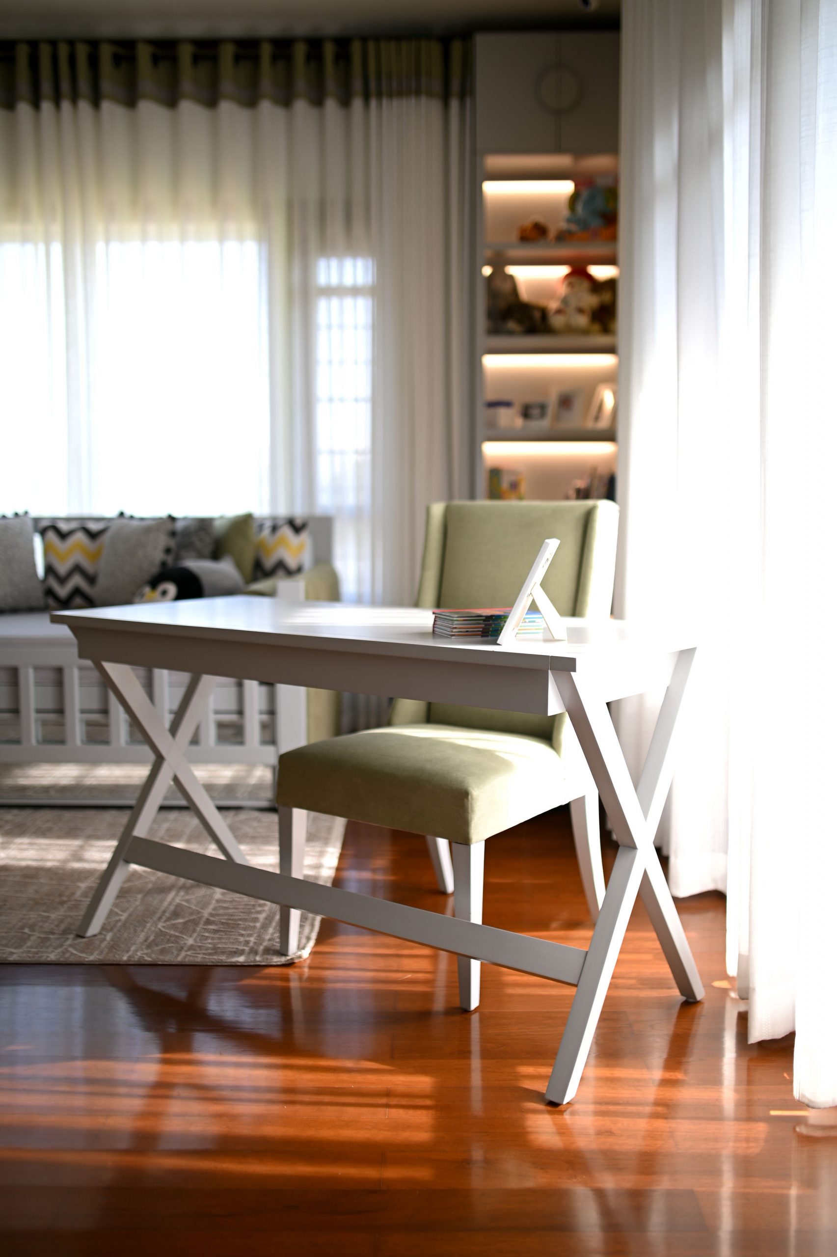 In the realm of design, where life meets functionality, we embarked on a project that beautifully blends the worlds of motherhood and productivity. Our latest creation is a nursery-office, a space where both mom and child can find solace and inspiration. A generous window bathes the room in natural light, connecting the indoors with the outdoors. It’s a portal to endless possibilities and moments of reflection. Brown wooden flooring sets the stage for a cozy and practical foundation. It’s a choice that balances aesthetics with the demands of daily life. A grey day bed becomes the heart of the nursery, adorned with pops of yellow cushions for a touch of cheerfulness. It’s a space where both mom and child can relax and bond.