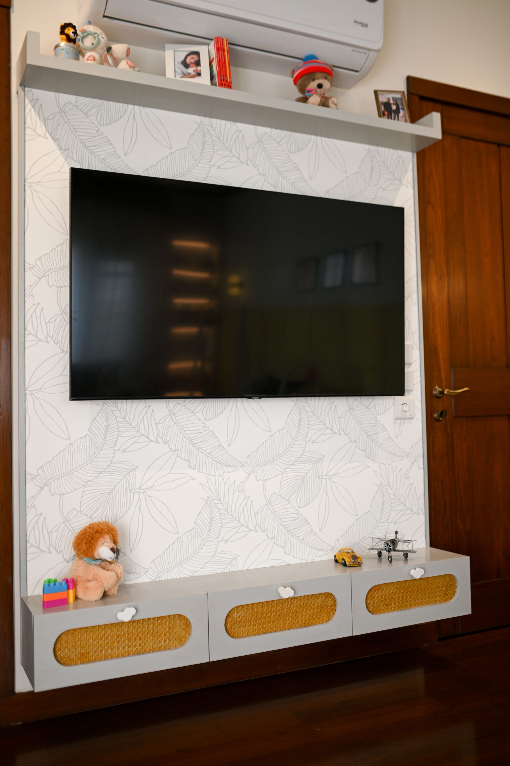Shelving units and a wood and cane unit provide storage and functionality, seamlessly blending the needs of work and nurture. The TV back wall comes alive with nature-inspired wallpaper, infusing the room with a sense of tranquility and connection to the natural world. Halfway paneling in a soft yellow hue adds a layer of elegance to the room, creating an ambiance of classic charm and warmth. Warm lighting gently caresses the room, casting a soft glow that invites comfort and creativity.