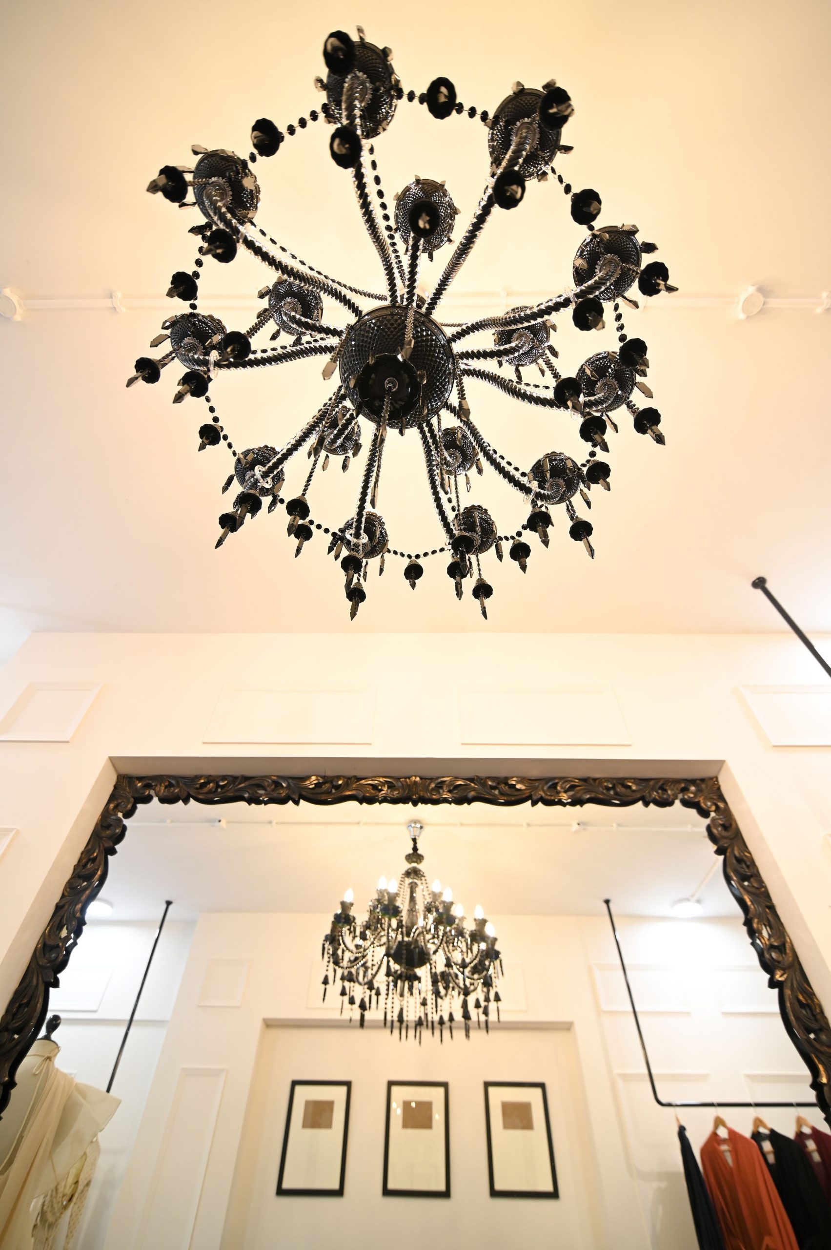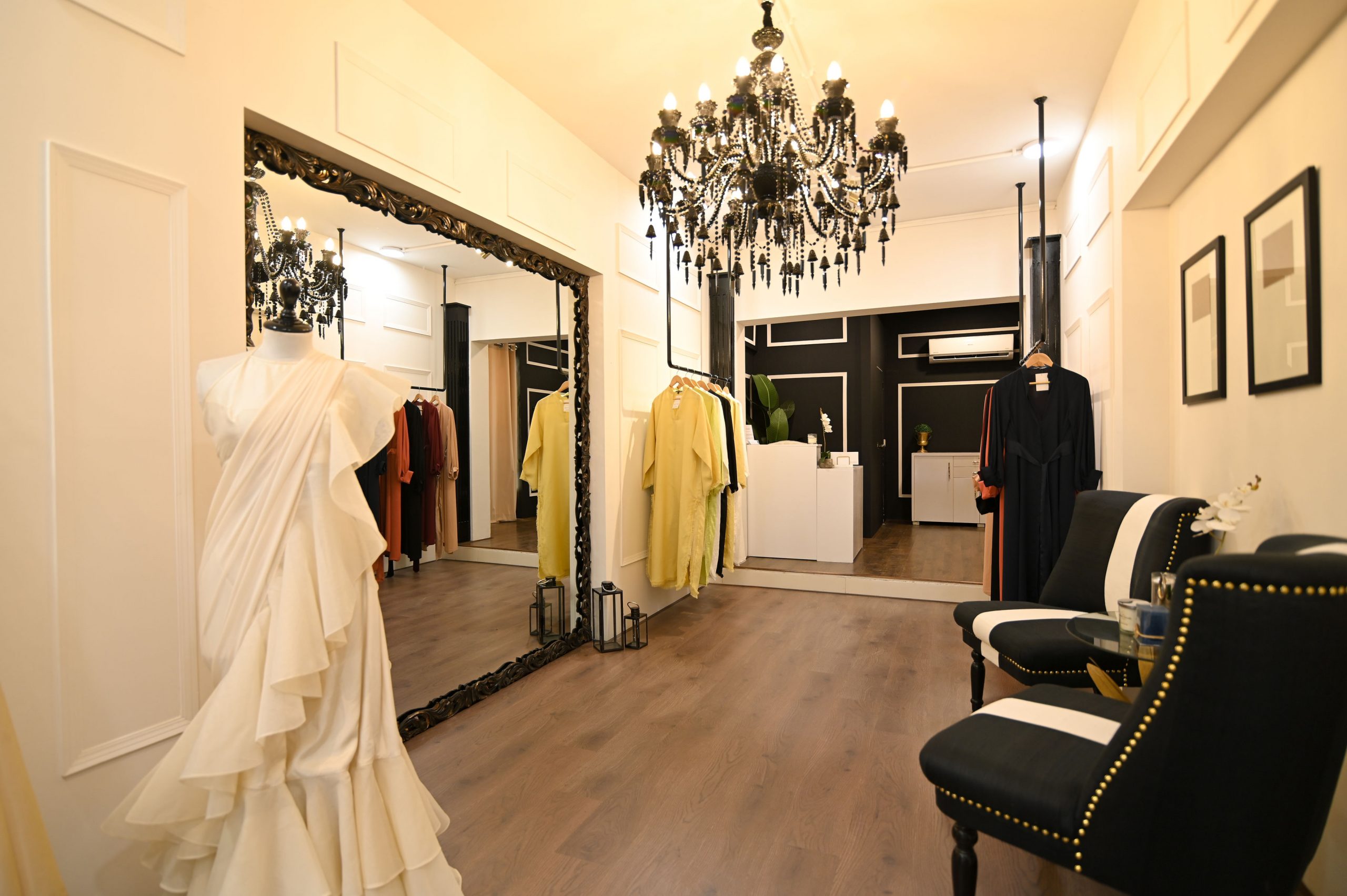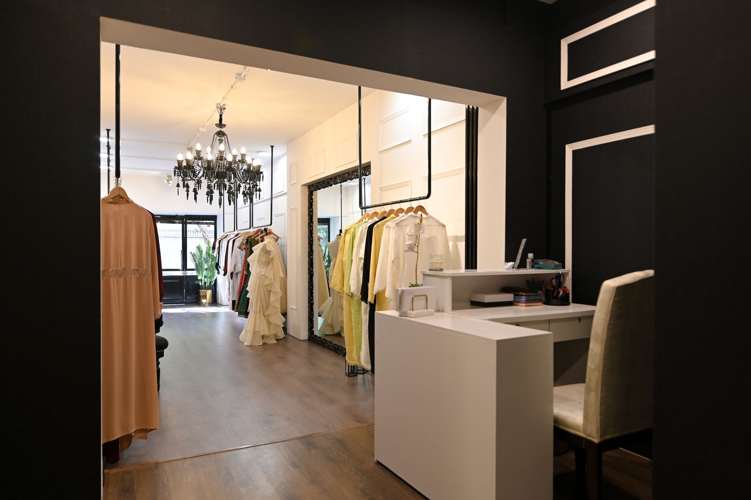 Step into a realm where style takes center stage, where every corner whispers the language of fashion. Our latest project, the boutique store, is a celebration of design and sophistication, meticulously crafted to showcase the art of clothing. Brown wood flooring forms the foundation of understated luxury, offering a warm and inviting embrace as you explore the curated collections. White walls adorned with French paneling greet you with timeless charm, creating an ambiance that resonates with classic elegance. The cash counter area is a study in contrasts, with white French paneling set against black walls, forming a striking backdrop for transactions. A black chandelier adds a touch of drama and opulence. Hanging rods stretch elegantly, displaying the latest fashion creations with precision and style. The mirror on one wall reflects the beauty of each garment, creating a captivating experience for customers. Black and white patterned armchairs offer both comfort and style, inviting customers to pause and immerse themselves in the world of fashion.